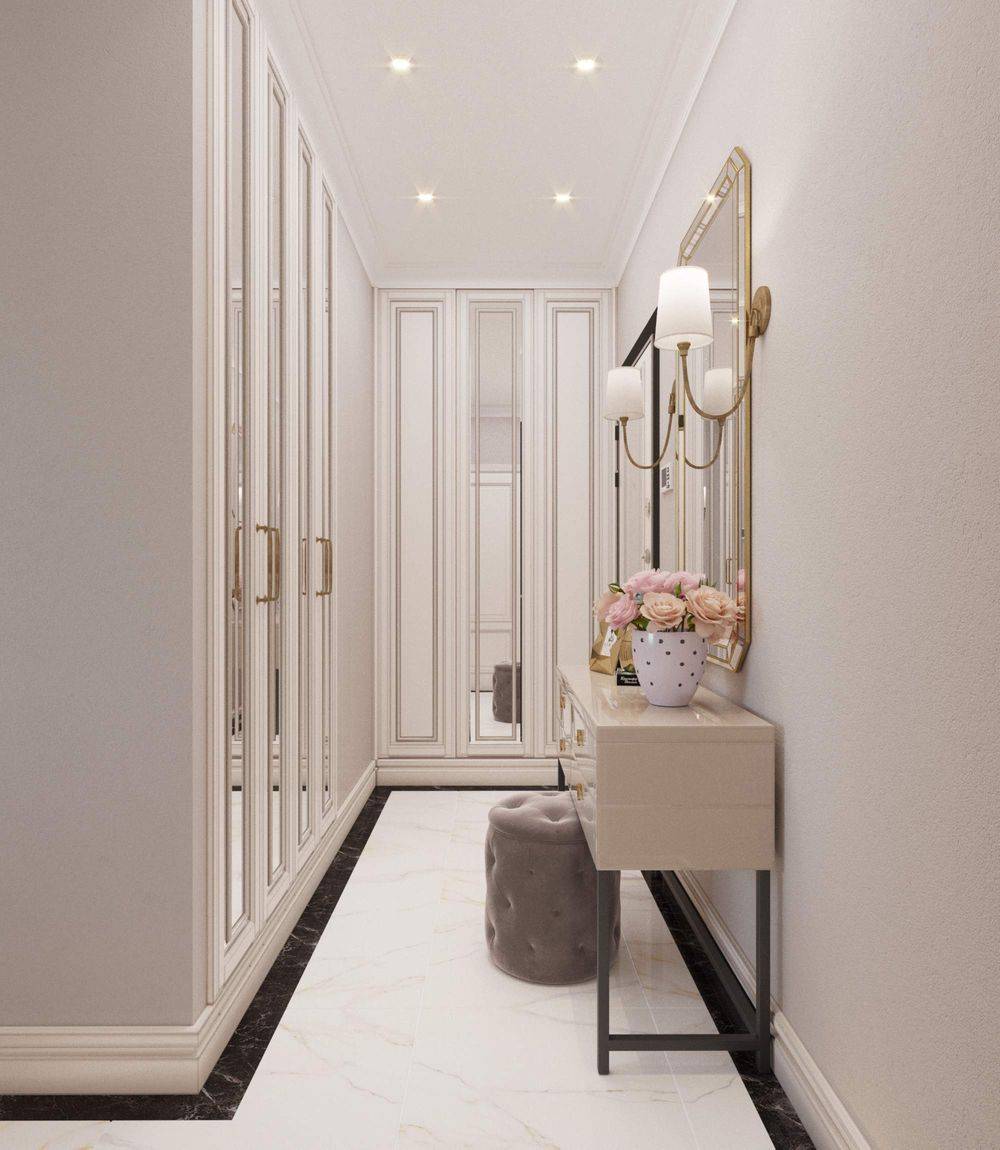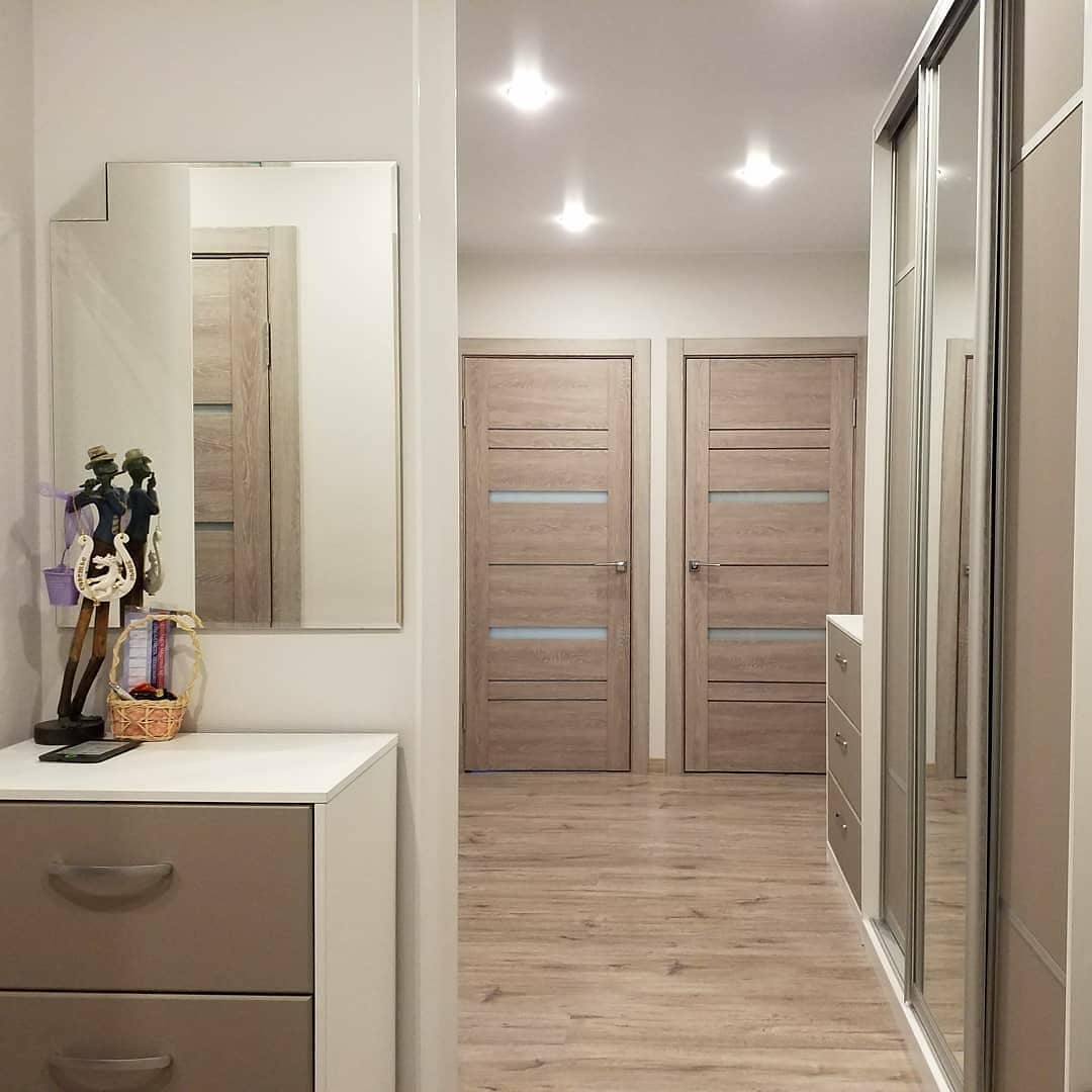 Люстры и классические светильники в прихожих совсем не актуальны. Особенно, когда это стандартная прихожая-коридор без окон в квартире. Тебе нужна серия потолочных светильников и зональная подсветка у зеркала и других важных зон. Интересный прием – подсветка у пола вдоль шкафа, чтобы можно было легко пройти даже ночью.