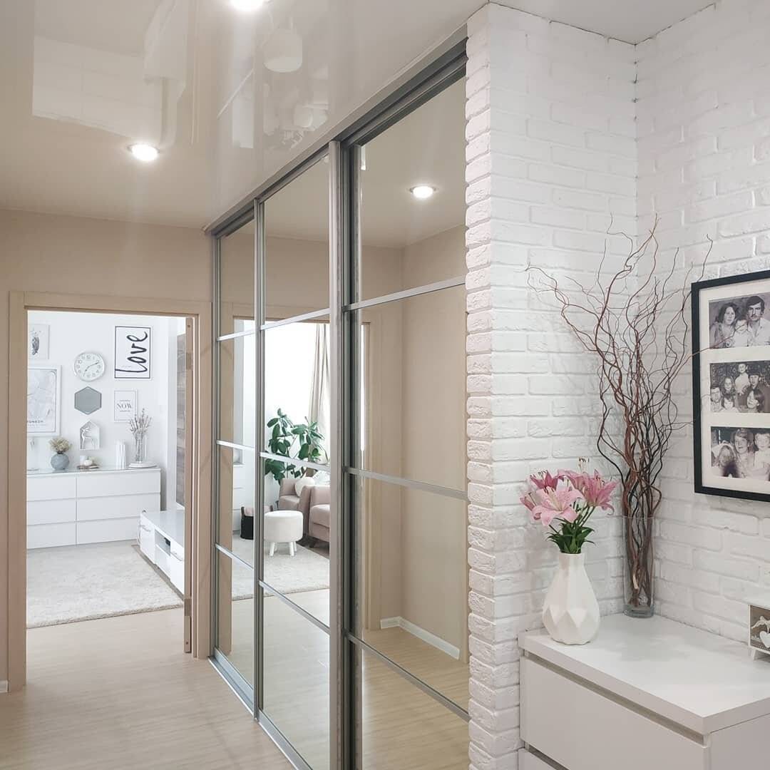 Для прихожей мы рекомендуем гипсокартонные или натяжные потолки, чтобы встроить туда серию светильников. Глянцевые натяжные полотна визуально увеличивают комнату почти вдвое, так что возьми этот прием на заметку.