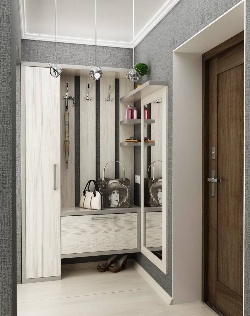 Маленькую комнату нельзя заставлять полностью. Она получится слишком тесной. Лучше комбинировать шкаф с тумбой, вешалкой и полкой. Можно выбрать сделанный на заказ вариант, который будет точно соответствовать габаритам прихожей. Если такое решение не подойдет, нужно использовать стандартные предметы. Но они образуют щель между верхом мебели и потолком. Там будет постоянно скапливаться пыль. Потому разумно заделать щель пенопластом. Обязательно маленький коридор дополняется большим зеркалом. Это позволит визуально увеличить пространство.