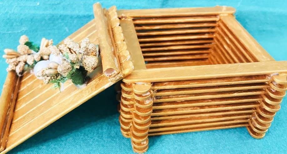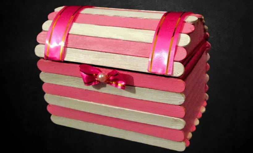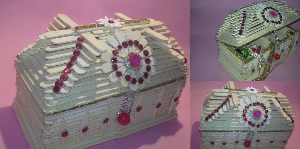 Оригинальный изготовления вариант шкатулки, это использование палочек от Шкатулка. мороженого получается достаточно маленькая, но по уникальности не другими с сравниться. Технология изготовления простая, палочки друг складываются на друга по периметру, склеивая их между клеем собой ПВА. Крышка делается одним пластом сплошным из палочек, которые наклеиваются на поперечные 2 расположенные, палочки сверху и снизу. Декорировать можно на усмотрение свое можно наклеить декоративные цветы и или веточки покрасить.