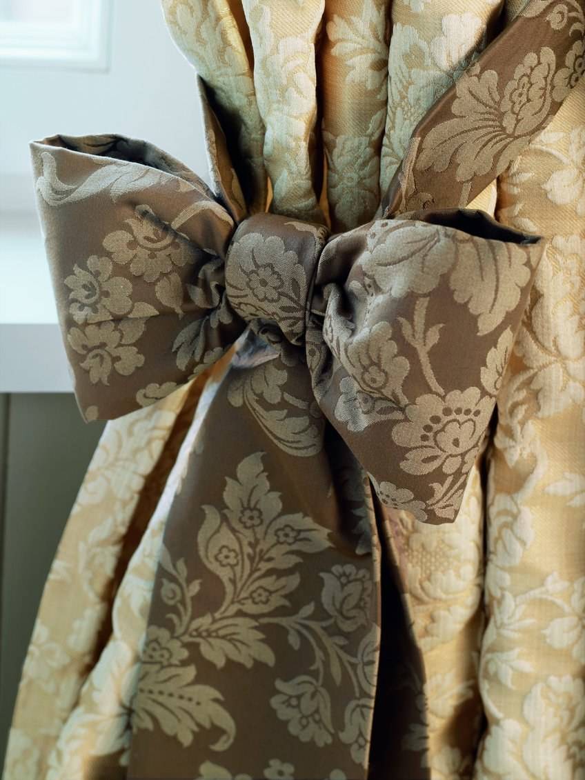 Простой, но в месте с тем элегантный способ — опоясать прямоугольный занавес легкой атласной либо шелковой лентой.