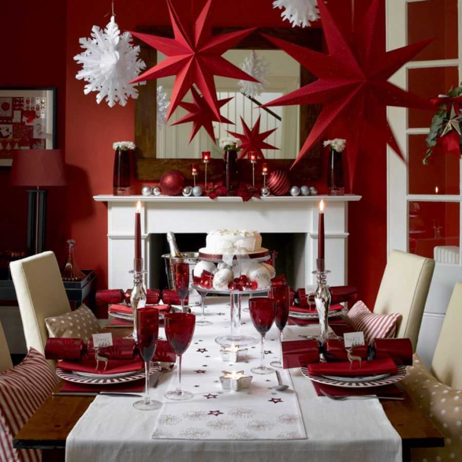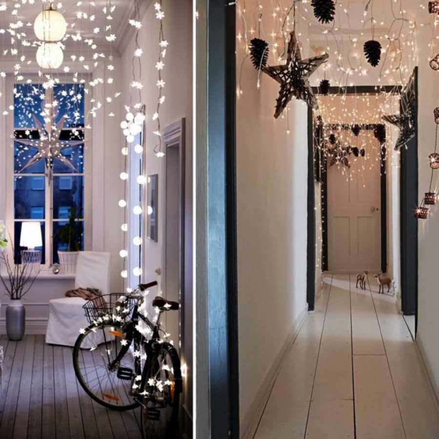 Декор квартиры к Новому году может быть сделан также из природных материалов, в частности из кусков древесной коры, шишек, орехов, веточек, сушеных ягод или фигурных листьев, ну и конечно из еловых веток. Сочетать такие элементы декора можно со свечами, ленточками и снежинками из бумаги.
