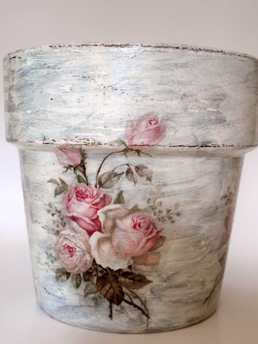 Методика оформления любой поверхности разными картинками из бумаги, салфеток – это декупаж. Таким способом можно оформить горшок из глины, пластика.