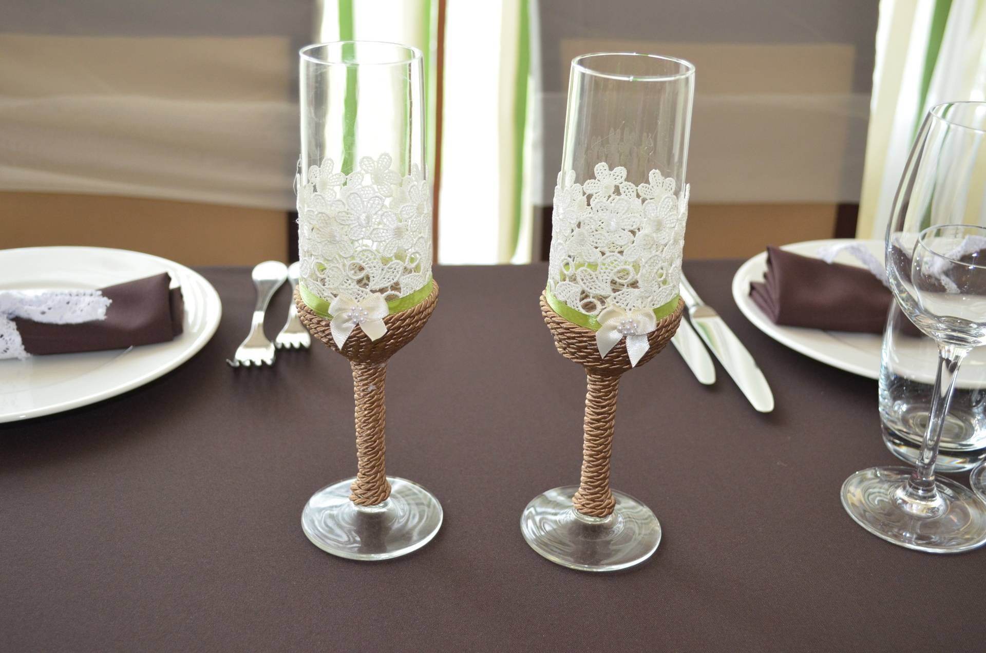Оформление фужеров должно быть оптимально вписано в общую тематику свадебного торжества. Если вы проводите мероприятие в стиле рустик, то фужеры можно задрапировать мешковиной