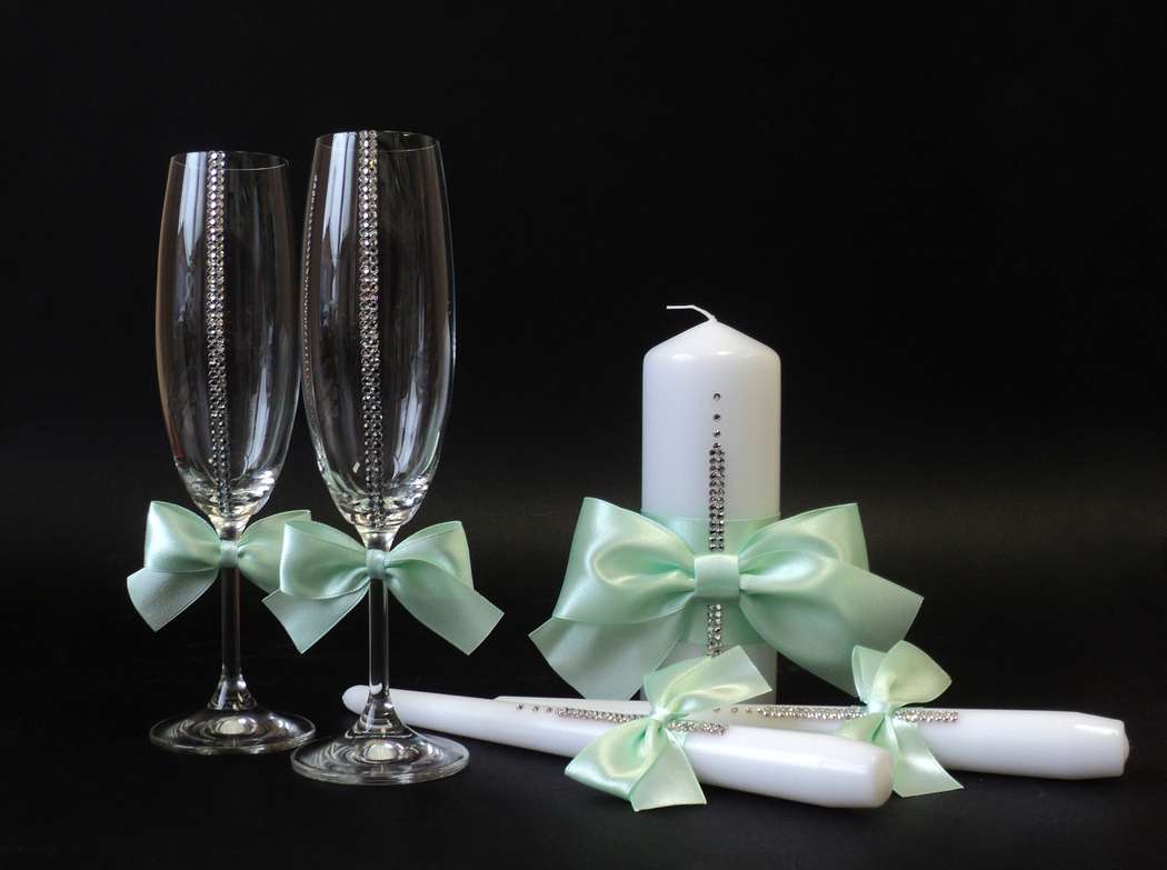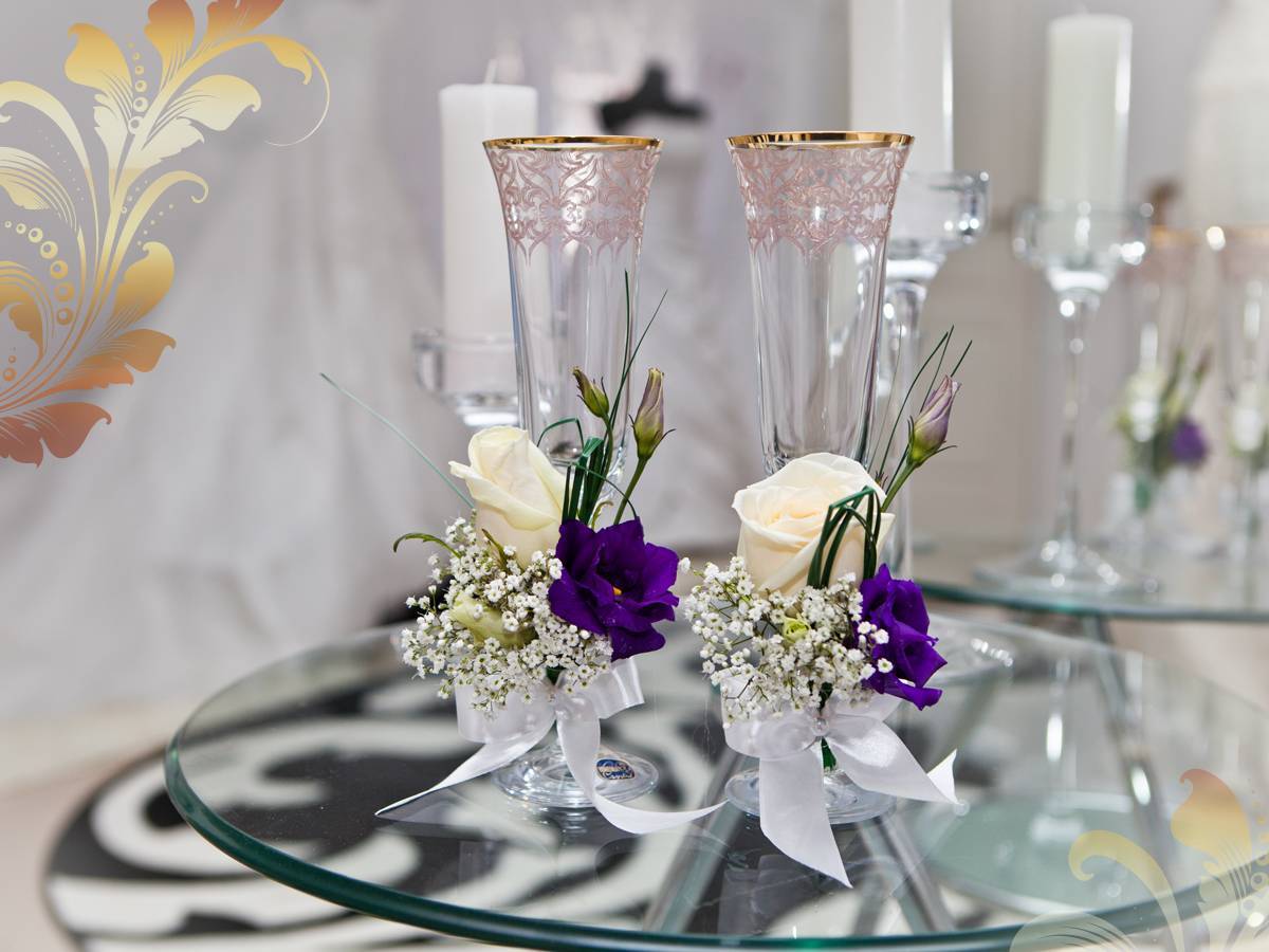 Традиционно используют винные бокалы на удлиненной тонкой ножке, хотя можно выбрать и какие-либо иные варианты. К примеру, довольно популярны парные фужеры на одной общей ножке – они, по сути, представляют довольно привлекательную подставку с парой углублений, в которые и вставляются бокалы. При желании можно отдать предпочтение бокалам в виде шестигранника, вогнутым стаканам и другим оригинальным изделиям.