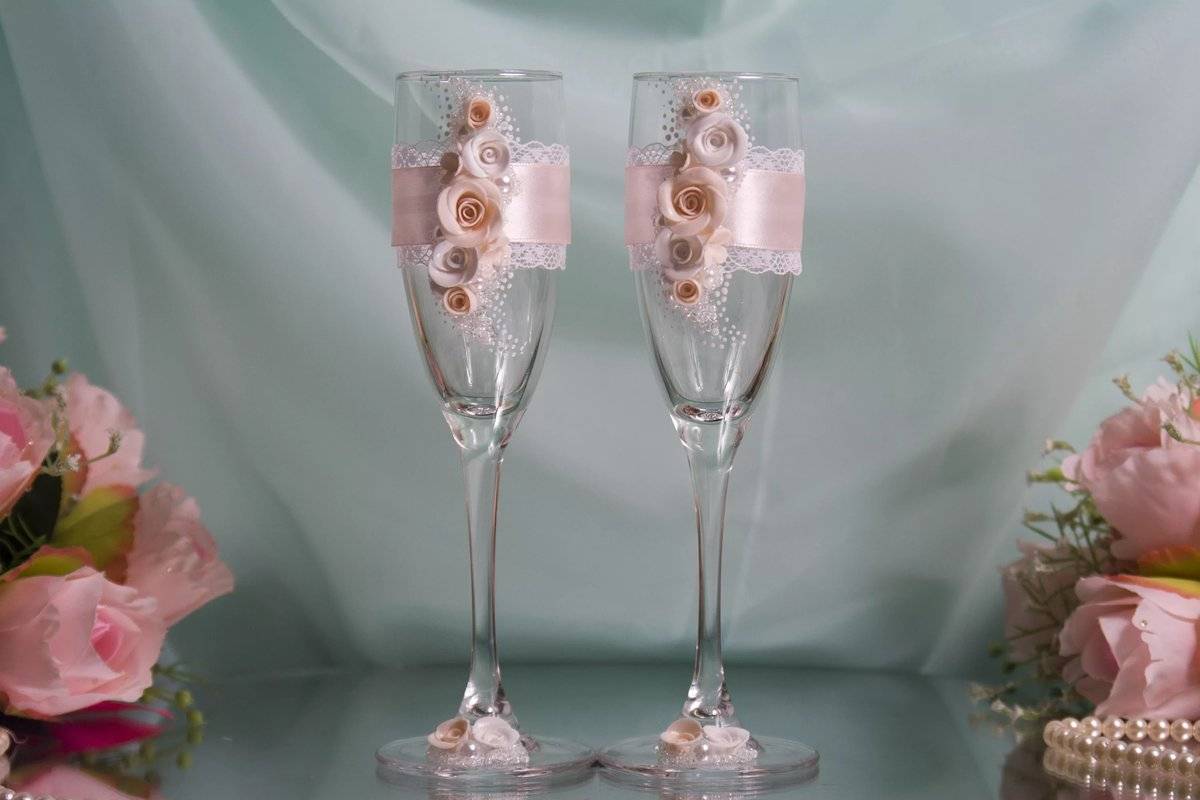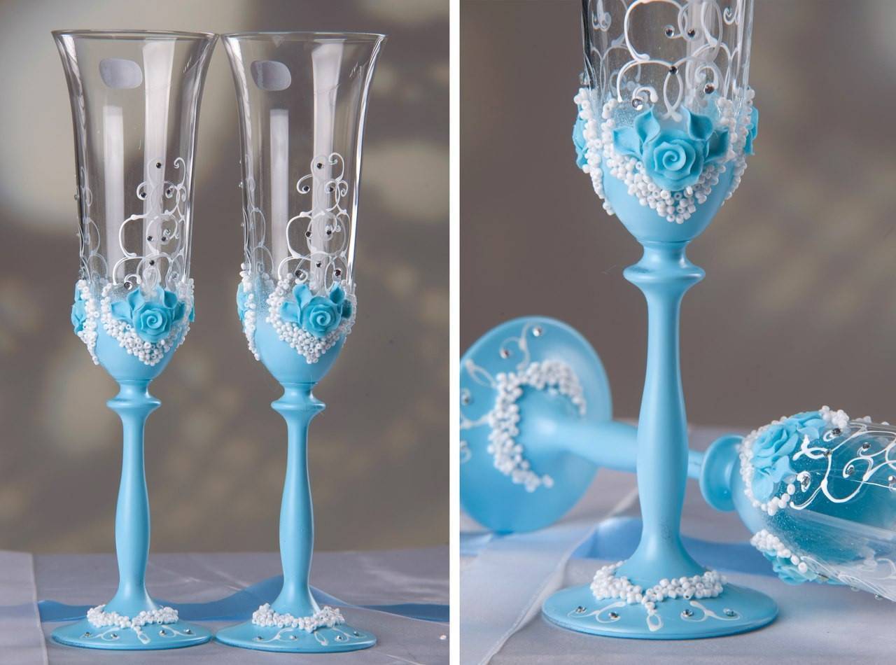 Свадебные бокалы, украшенные лентами, смотрятся мило и нежно. Этот декоративный элемент способен придать праздничности любому фужеру – порой хватит повязать ленточку на верхнюю часть ножки, чтобы обычная посуда превратилась в настоящий свадебный атрибут. Ниже будет рассмотрен вариант самостоятельного оформления свадебного атрибута при помощи полимерной глины и изящных атласных лент