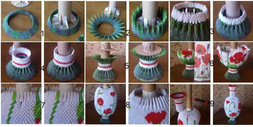 Из цветной или простой бумаги можно создать красивые вазочки. Поделка-оригами ваза не отличается особой прочностью, и может вместить в себя только бумажные цветы, но смотрится такое изделие всегда оригинально.