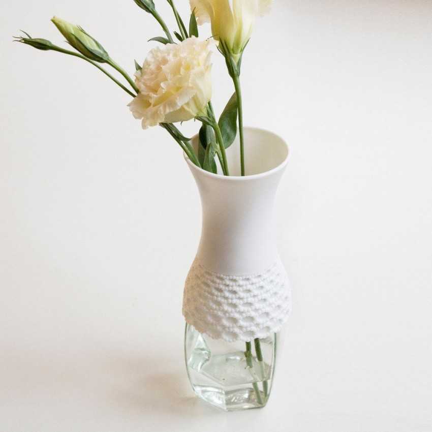 По мере заполнения всей наружной площади (кроме низа) нить обрезают, аккуратно запрятав ее конец. Такой дизайн прост и в то же время эффектен. В подобную вазу можно поставить живые цветы, ее можно украсить узлами из рабочего материала.