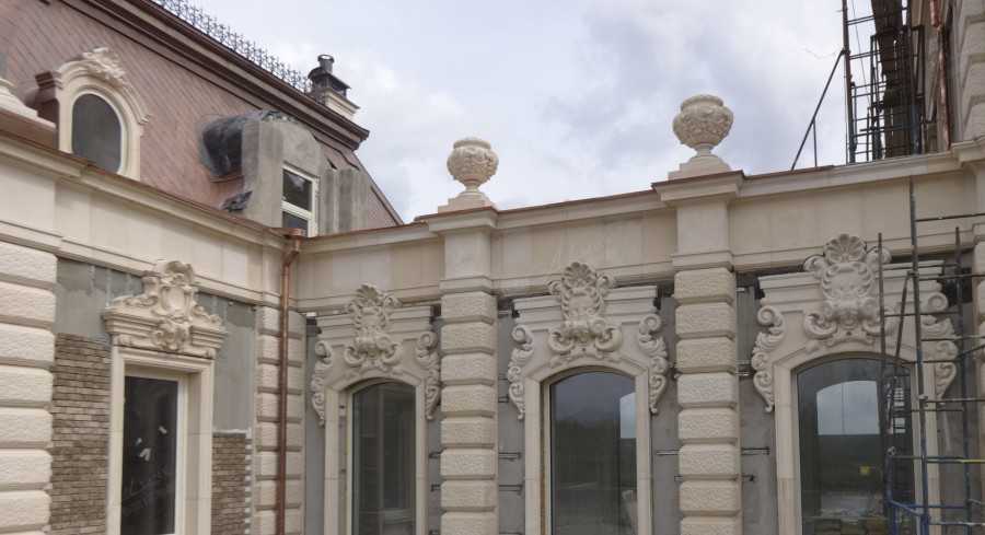 Используется стекловолоконный бетон не только для облицовки здания, но и для реставрационных работ. Из-за процесса производства стоимость декора фасада из этого материала остаётся приемлемой для многих покупателей.