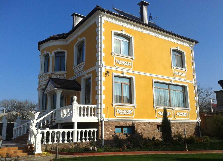 Одно из самых простых и эффектных решений — украшение фасада элементами из лепнины. Однако гипсовые элементы — самый неподходящий вариант, так как гипс на открытом воздухе «зацветает» и разрушается. Самый рациональный выбор – декор из пенополистирола. Пенополистирол классифицируется по прочности согласно ГОСТ 15588-86. Чем выше плотность материала, тем он прочнее. Для фасадных работ подойдет пенополистирол плотностью 25 (средняя прочность), 35 (высокая) и 50 (максимальная). Детали из этого материала изготавливаются путем терморезки по индивидуальным чертежам, причем физические свойства пенополистирола позволяют создавать детали сложной формы и любого профиля. По желанию заказчика на детали может быть нанесен защитный слой с добавлением мраморной крошки, армирующих элементов, латекса и пр.