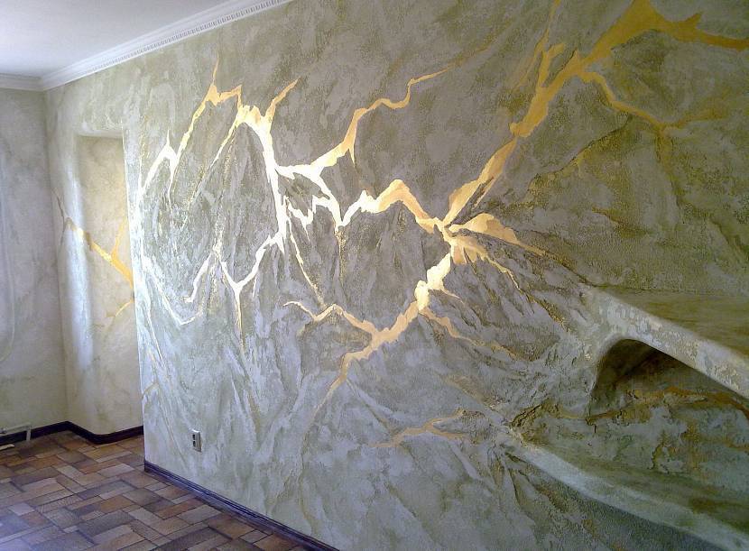 Рельефная штукатурка с эффектом кракелюр при высыхании красиво растрескивается, и стена равномерно покрывается мелкими колоритными трещинками. Покрытие можно сочетать с другими видами штукатурки — например, венецианской или марокканской (их наносят поверх высохшего кракелюра).