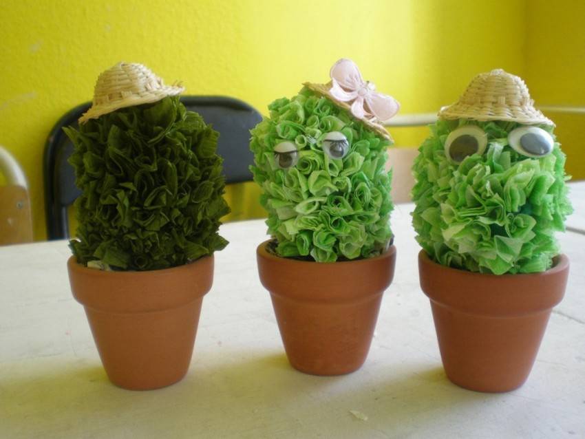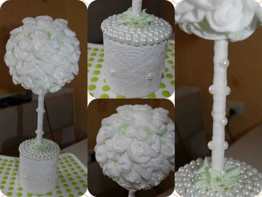 Существуют различные варианты поделок. Особо популярны комнатные топиарии. Декоративные модели с оригинальной кроной, сделанные мастерицами, станут прекрасным подарком к празднику или иному торжеству. Так, можно смастерить мини-деревце счастья, создать топиарий к Новому году или изготовить денежное дерево. В последние годы такие поделки нередко используют в качестве свадебного декора.