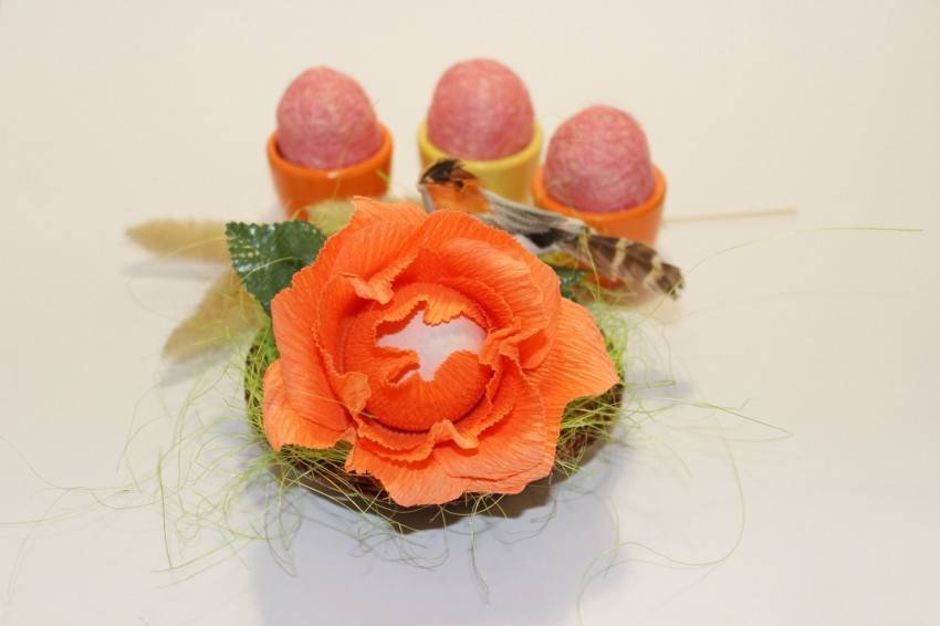Цветы на проволоке крепить к шару в следующей последовательности: создание отверстия под «стебель» — заполнение отверстия каплей клея – посадка цветка до упора (см. фото ниже).
