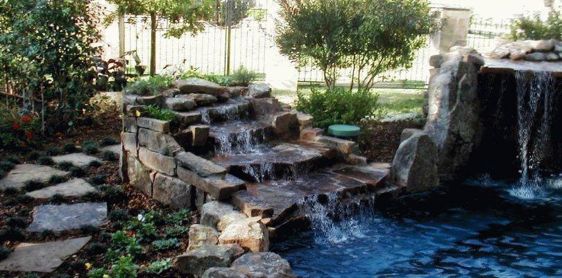 Как правило, высота садовых водопадов составляет не более 1,5 м. Если планируем сделать уступы, то используем для этого песчаник – он выглядит естественно, да и обрабатывать его несложно.