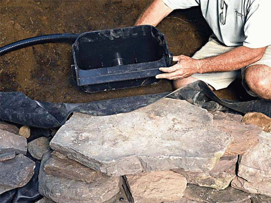 Купленный насос устанавливаем на дне пруда, но таким образом, чтобы он – равно как и идущие к нему провода – был незаметен.