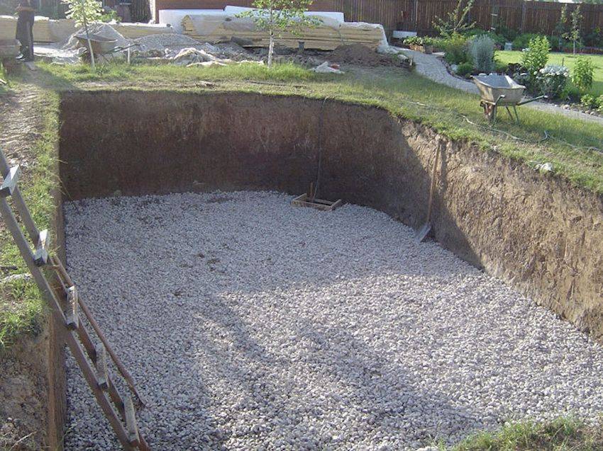 - Далее, делаем дренажную подушку из мелкого гравия, песка. Они помогут предотвратить деформацию емкости при наполнении;