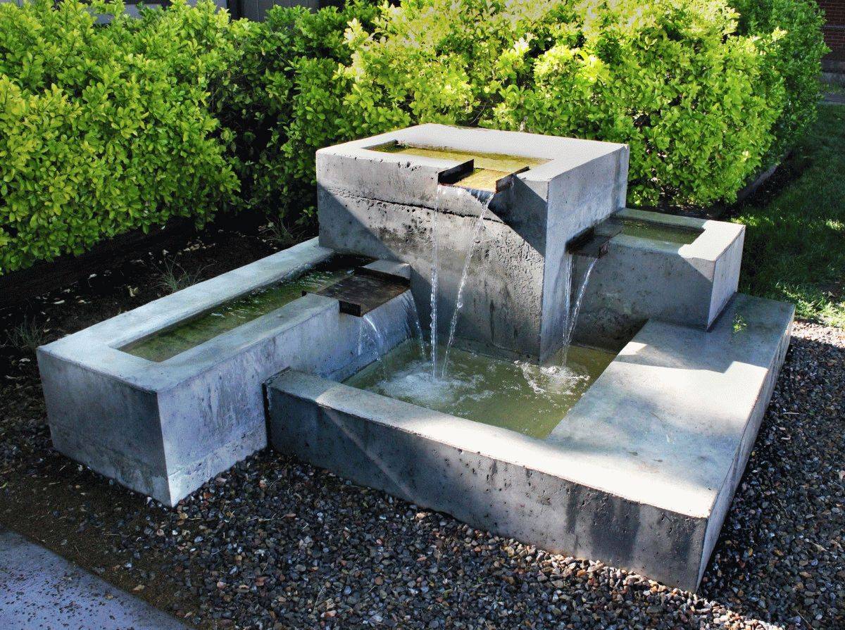 современный сад – фонтаны возводятся из металла и бетона, натурального и искусственного камня, полимеров и стекла. Такой фонтан – это продуманная композиция, стилистическую принадлежность которой подчеркивают декоративные элементы, делающие её насыщенной и интересной. Для фонтанов в стиле минимализм характерны тонкие, нитевидные струи воды