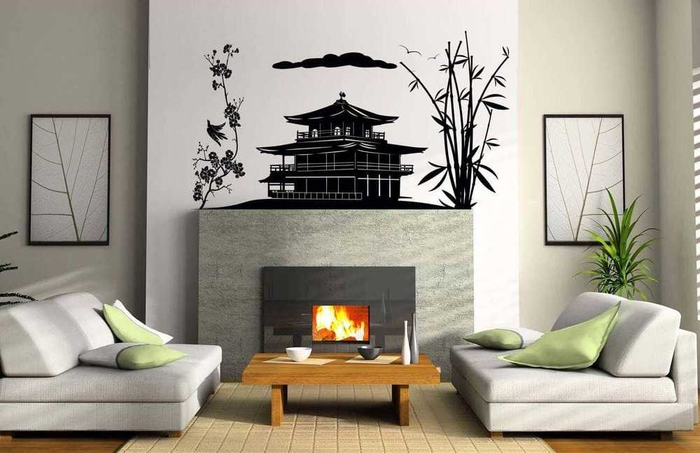 Тематический декор наклейки на стены тоже должен соответствовать теме оформления комнаты. Согласитесь, большой рисунок, на котором изображен японский сад, плохо будет смотреться в обычном среднестатистическом дизайне. Здесь вообще будет неуместна какая-либо большая яркая цветная картинка. Поэтому к выбору стикера нужно относиться очень ответственно.
