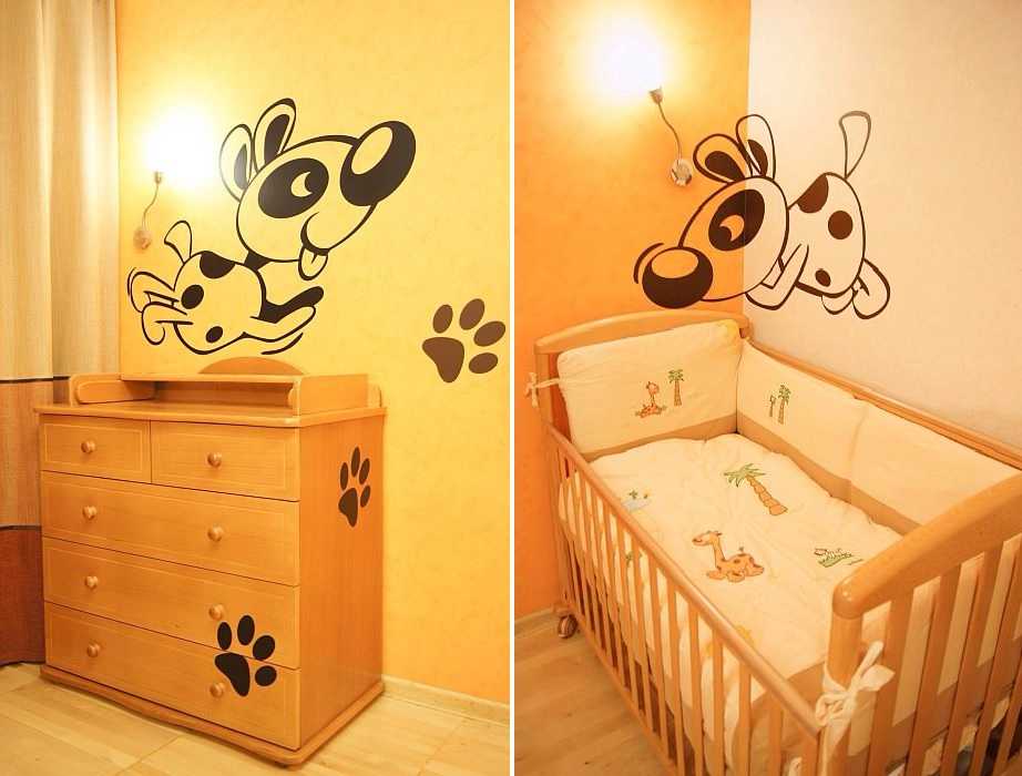 Отличным вариантом использования наклеек в интерьере будут однотонные стены детской комнаты. Посоветуйтесь с ребенком и украсьте его помещение, используя наклейки бабочки на стену или изображения любимых мультяшных героев. Вскоре малыш подрастет, и ему захочется видеть на стене своей комнаты более «взрослые рисунки», тогда без проблем можно переклеить стикеры, заменив их более подходящими, и помещение будет выглядеть уже совсем по-другому.