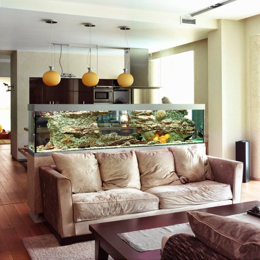 Данная идея является одновременно и элементом зонирования, и украшения гостиной. Но подойдет только для просторных помещений. Для кухни-гостиной средних размеров можно отыскать узкие аквариумы, которые не повлияют на восприятие размеров комнаты.