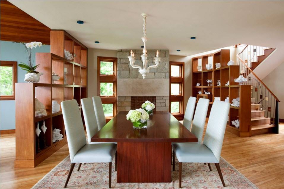 В данном интерьере невысокий стеллаж входит в состав выступающие части кухонного гарнитура. Такое решение позволяет отделить рабочую зону от столовой, выберите место для хранения книг или другого декора.