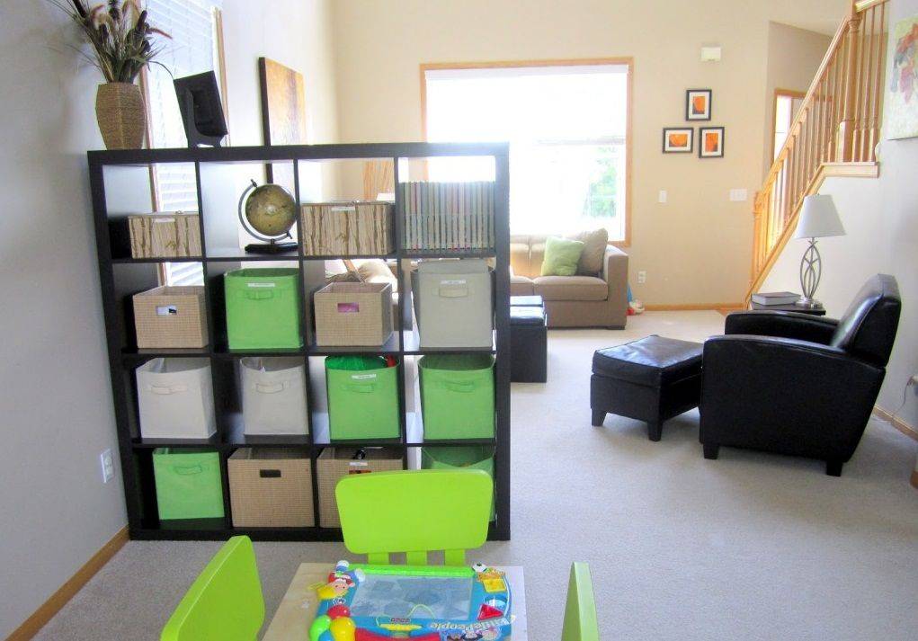 Оригинальными стеллажами может быть разделена детская комната на спальню, гостиную и рабочую зону. В помещении для маленьких детей рабочее место можно заменить игровой зоной.
