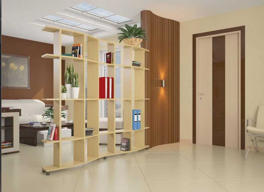 - Стеллаж. Легкая конструкция, не имеющая задней стенки. Стороны изделия отделываются одинаково или в соответствии с дизайном отгороженного пространства. Разделение происходит условно, т.к. между полками остаются просветы. Плюс стеллажа-перегородки заключается в возможности свободного доступа к вещам из обеих зон. Сооружение используется для размещения книг, сувениров, посуды, цветов и аквариумов.