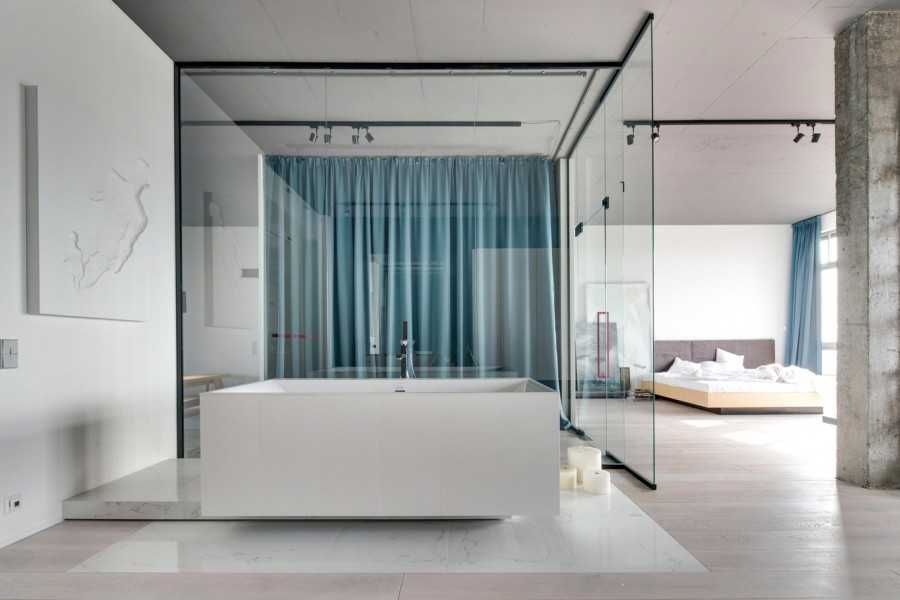 Перегородка с добавлением стекла используется в стилистических дизайнерских решениях, отличный вариант необычного зонирования.