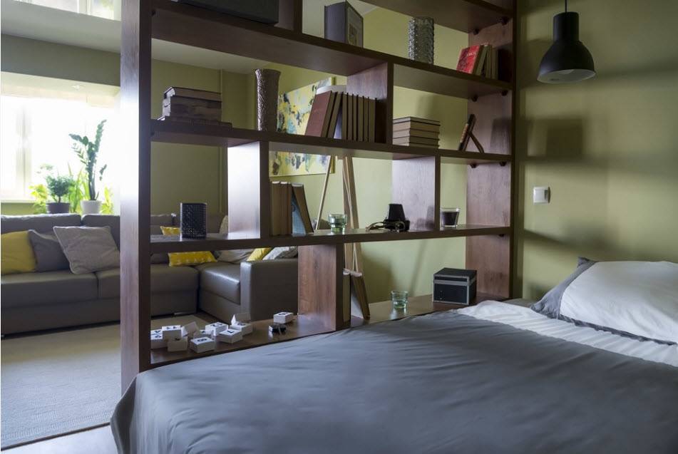 Стеллаж прекрасно дополнит любой дизайн комнаты, но не гарантирует звукоизоляцию и интимность. Диван поможет визуально отделить зоны.
