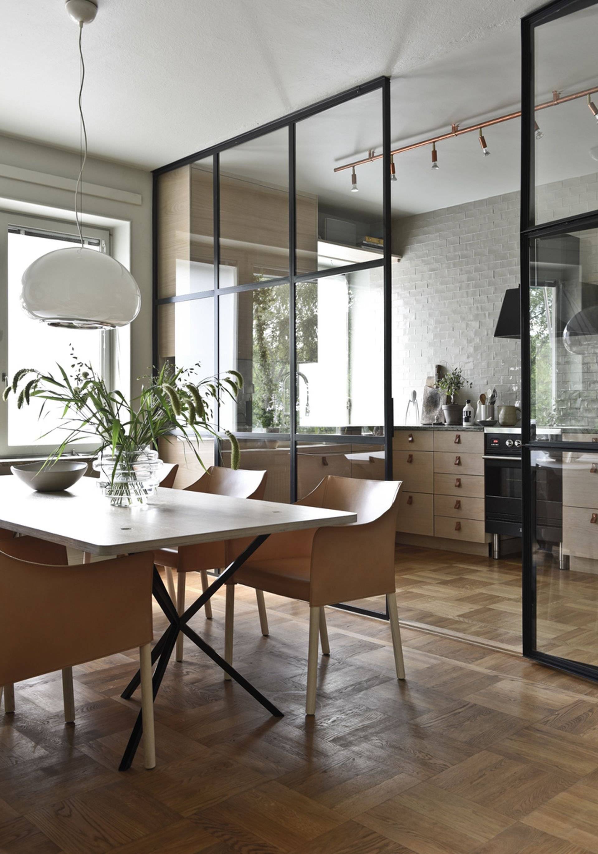 Лучше всего устанавливать стеклянную перегородку напротив окна, чтобы кухня получала больше света.