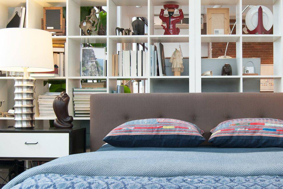 Стеллаж в интерьере спальни-гостинойИсточник design-homes.ru