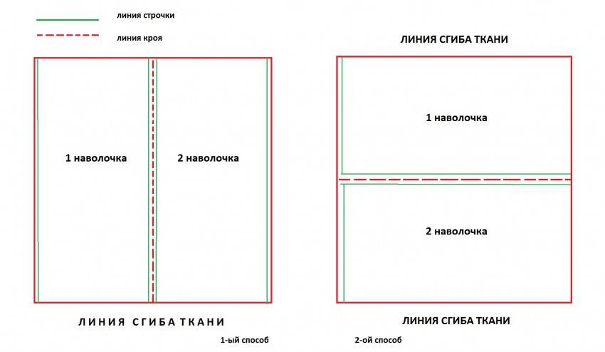 При переносе выкройки на ткань для пошива чехла подушки прибавляется один—два дополнительных сантиметра для швов. При выкраивании такой декоративной наволочки число прибавленных сантиметров увеличивается до трех—четырех. Выкройка переносится на ткань, свернутую пополам «лицом» внутрь. В итоге получатся две части чехла или декоративной наволочки для него.