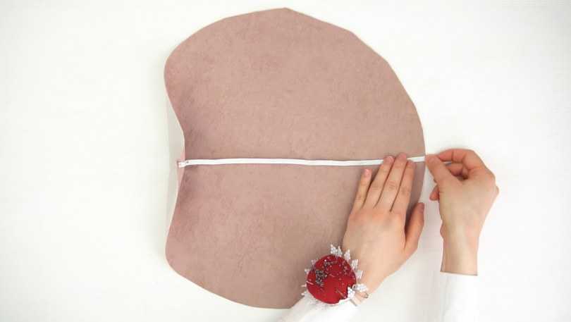 - Сопоставить оба готовых материала лицом друг к другу, пришить на изнанке молнию, соединяющую два края (помним про отступ).