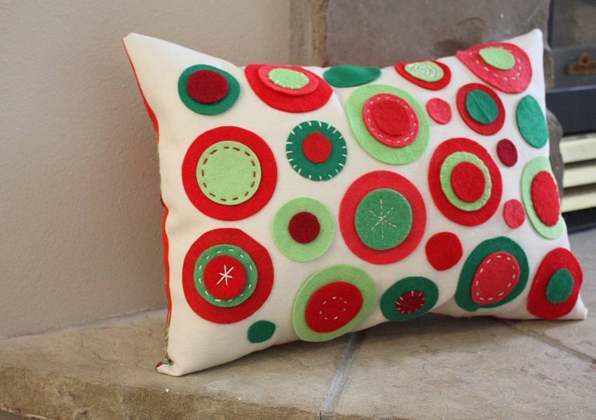 Также можно сделать нашивки-аппликации из фетра в форме геометрических фигур, в данном случае кружки разных размеров. Разнообразие цветов играет важную роль в декоре. С цветами нужно не переборщить. Если в комнате и без того много пестрых предметов, пестрая подушка будет лишняя. А вот однотонный интерьер такая подушка разбавит.