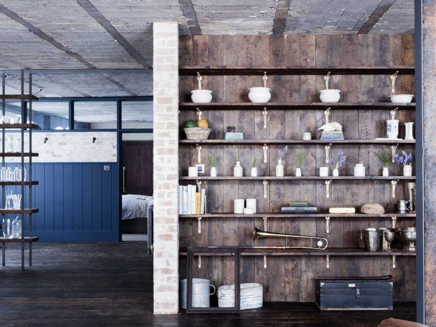 Контрастные текстуры кухонных навесных открытых полок на стальном каркасе делают их заметным декоративным элементом интерьера. Особая роль им отводится в кухонной зоне лофт-апартаментов: здесь открывается простор для фантазии дизайнера. Для полок в стиле лофт и стимпанк обычно подбирают выразительные фактуры «старого» дерева и замысловатые металлические трубы с фитингами – в качестве каркаса.