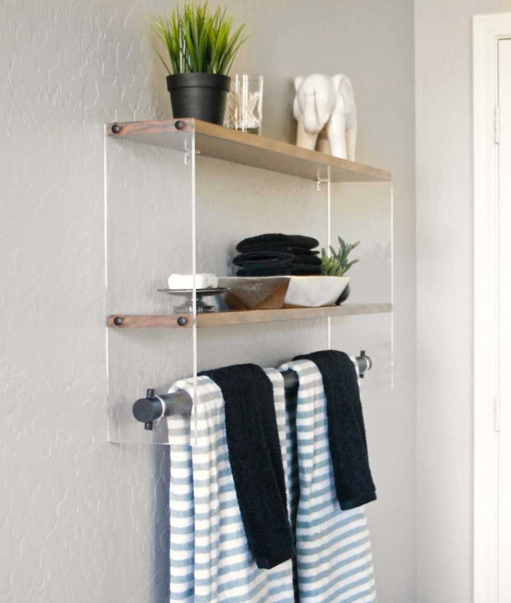 Особенно интересным материалом для полки выступает стекло. Выглядит очень красиво, лично мне больше нравится матовое, но здесь вы будете упираться в одно условие – каркас то вы можете и сами сделать, но саму полку нужно будет покупать, если только вы не работаете со стеклом профессионально.