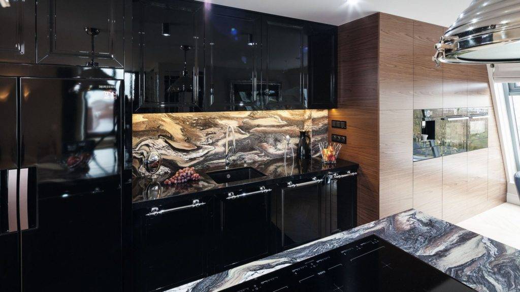 Гранит — самый твердый камень, устойчивый к истиранию. Он также нечувствителен к химическим веществам, поэтому его можно использовать на кухонных столешницах. Помните, что гранит является тяжелым материалом, поэтому он требует прочного фундамента. Благодаря стойкости к влаге и истиранию, камень идеально подходит для кухни между подвесными и стоящими шкафами.