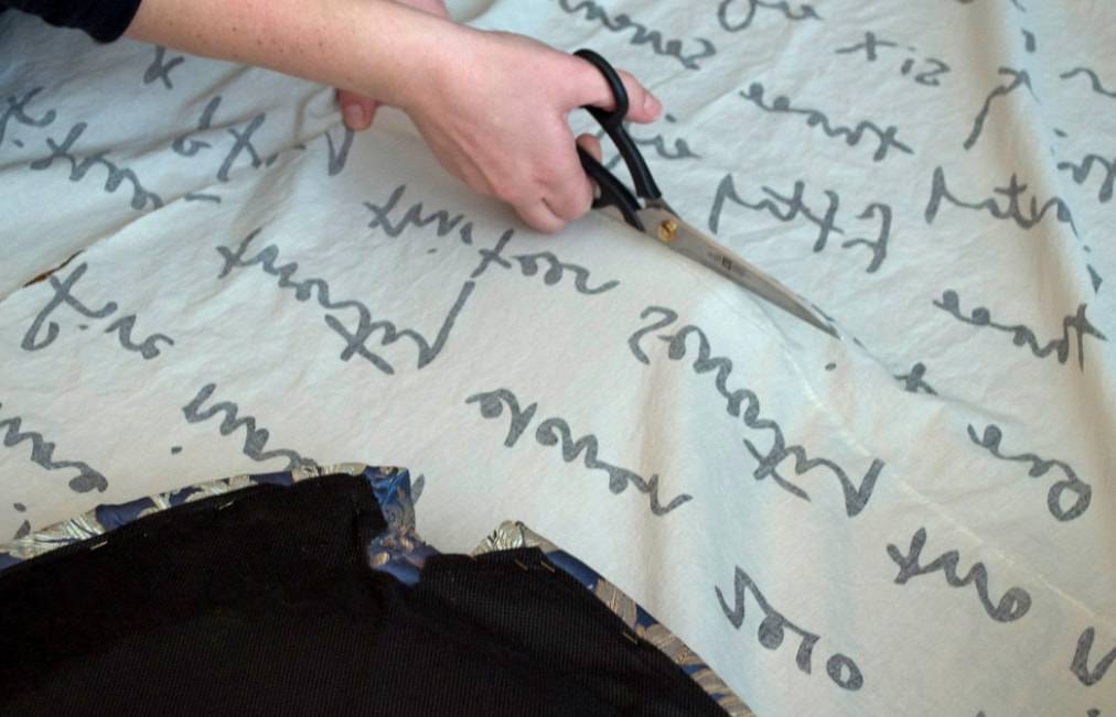 Белая ткань с надписями смотрится довольно привлекательно, но все же предлагаем ее немного тонировать с помощью чая.
