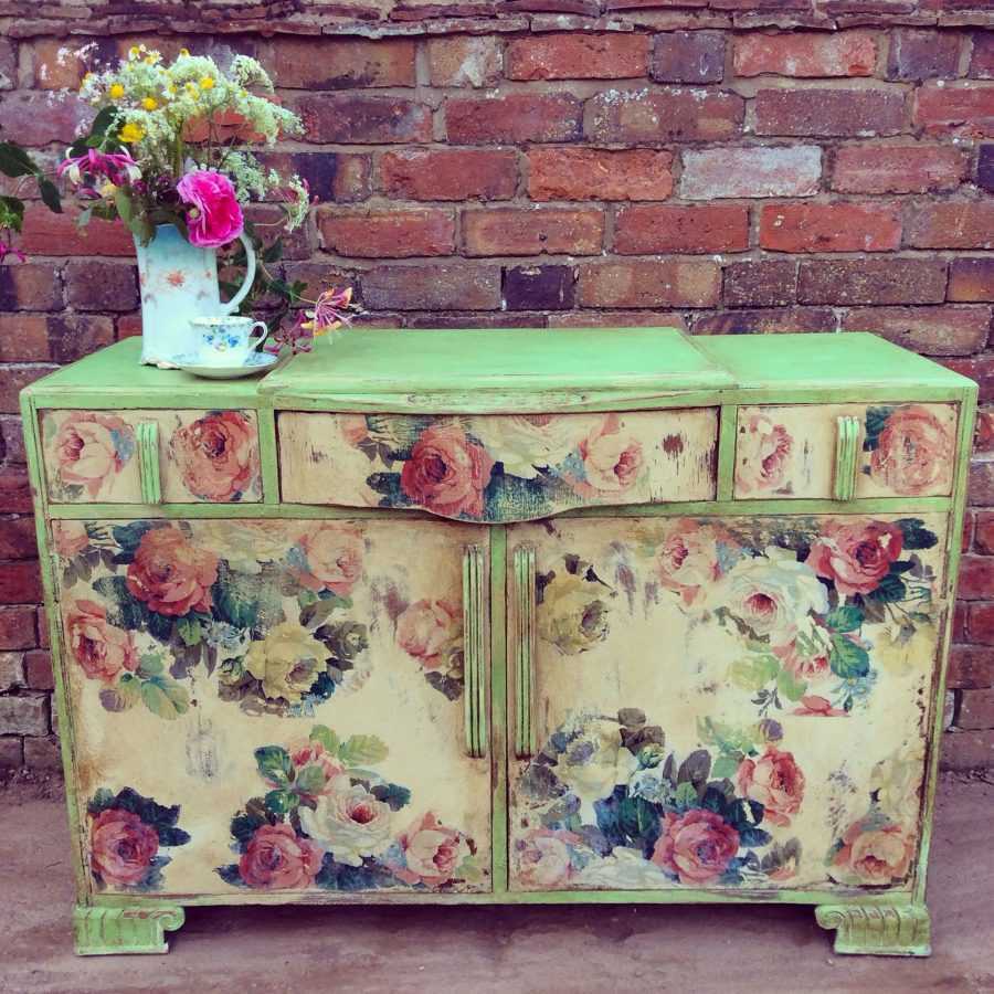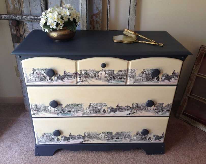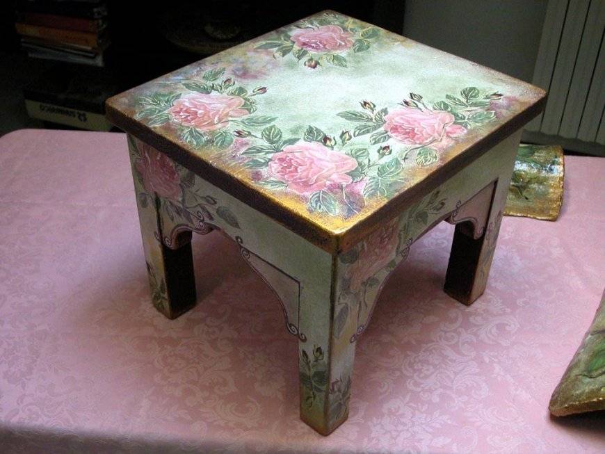 Декор для мебели из дерева в таком стиле, основан на технике наклеивания картинок на поверхность, на которые затем наносится лак. Хорошо смотрится на тумбочках, табуретках, столах, комодах, шкафах. Поэтапный декор старой мебели включает в себя: