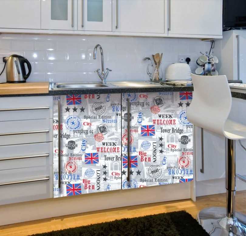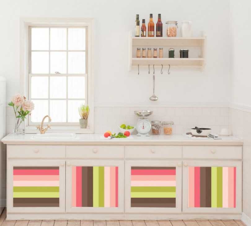 В процессе оклеивания пленки нужно следить за тем, чтобы материал наклеивался ровно, без пузырей и не топорщился. Деформаций пленки можно избежать, помогая себе валиком для разглаживания покрытия. Вот и все рекомендации по декорированию старых гарнитуров пленкой. При желании можно использовать несколько расцветок клейкой ленты, что поможет создать яркий и необычный дизайн комнаты.