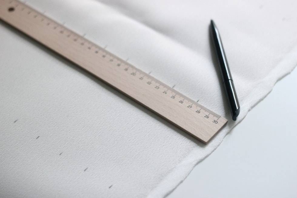 Особое внимание стоит уделить углам, так как ткань в этих местах должна лежать идеально и без лишних складок. Из остатков ткани вырезаем прямоугольник по размерам столешницы