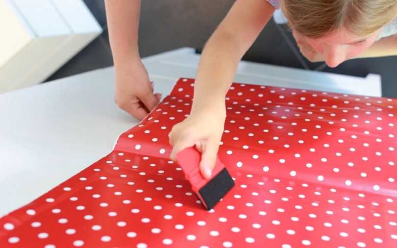 На подготовленную поверхность аккуратно клеится пленка. Следует помнить, что она продается в рулонах разной ширины. Если ваша мебель нестандартных размеров или не соответствует ширине полотна пленки, то лишнее необходимо просто обрезать