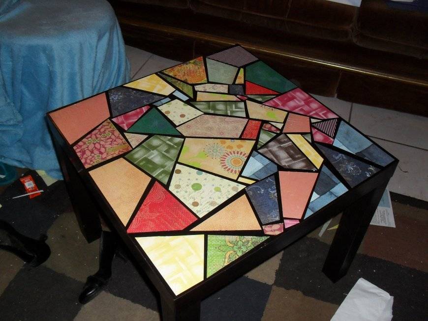 Из остатков ткани вырезаем прямоугольник по размерам столешницы. Подворачиваем края и прикрепляем ее по периметру степлером. Прикручиваем ножки стола и проверяем его на прочность.