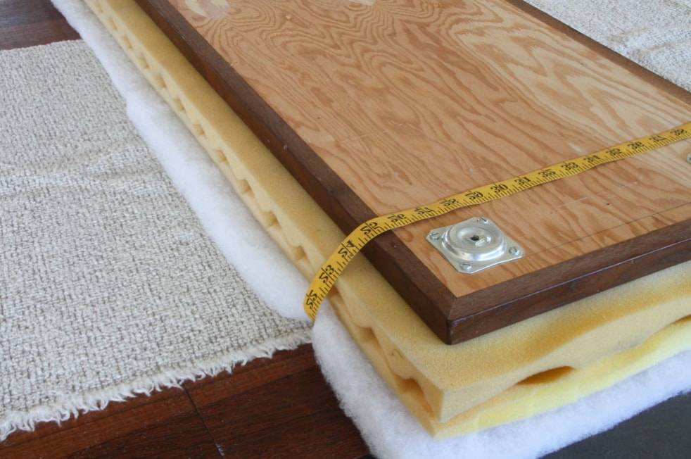 Для начала измеряем столешницу, после чего делаем разметку на толстом поролоне для первой подкладки. Обязательно делаем припуски, не меньше 3 см с каждой стороны.