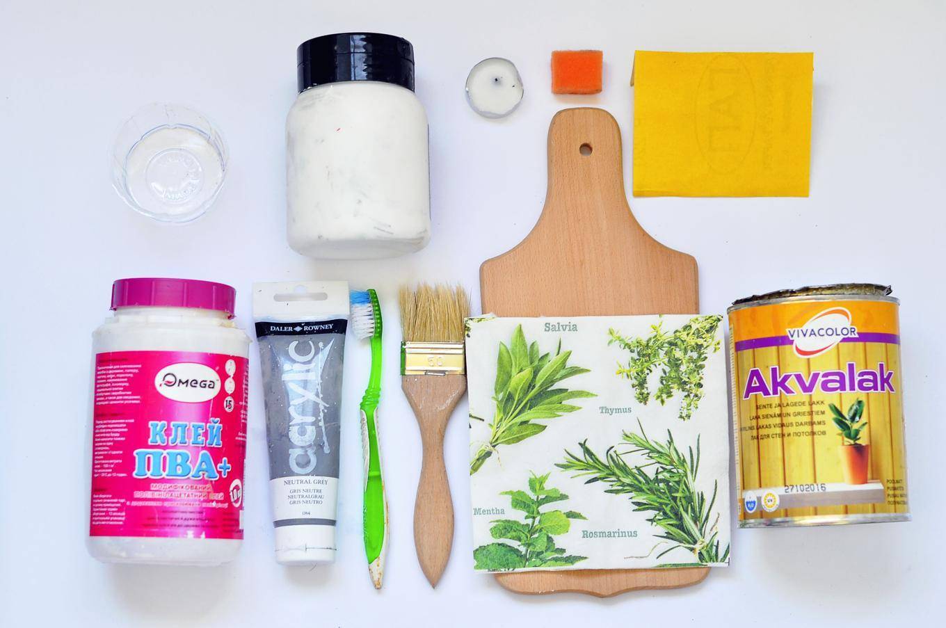 один из основных элементов – это клей, который может быть как профессиональный, специально разработанный для техники декупажа, так и обычный канцелярский ПВА;