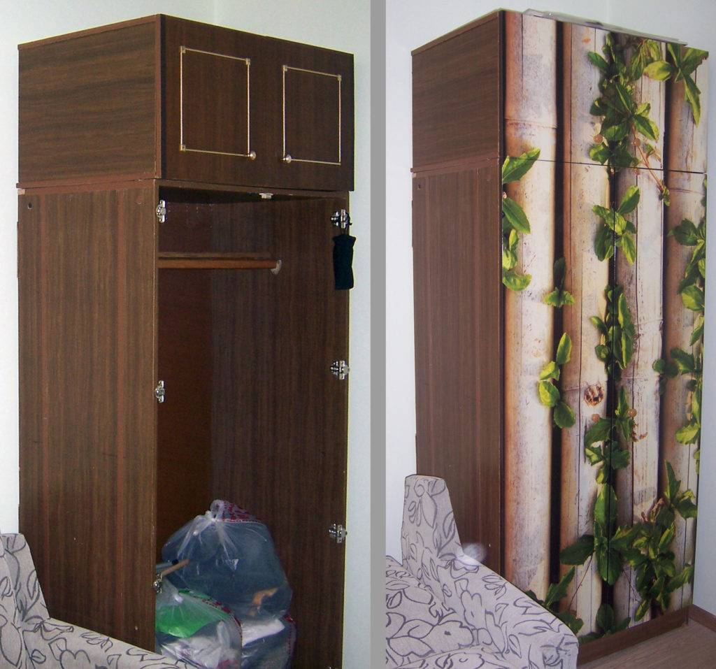 - Производится приклеивание обойного полотна или вырезок с изображением на мебель. Для разглаживания рекомендуется использовать резиновый валик. Работать нужно от середины к краям. Все движения должны быть предельно осторожными, поскольку пропитанная клеем бумага легко рвется.