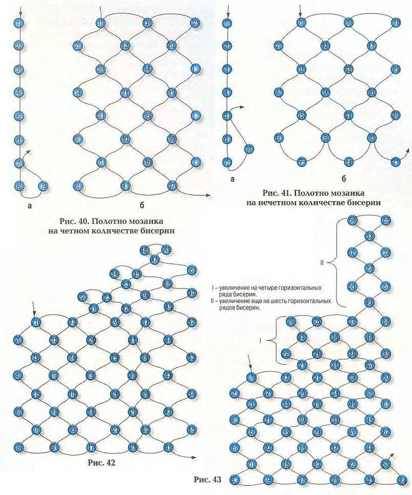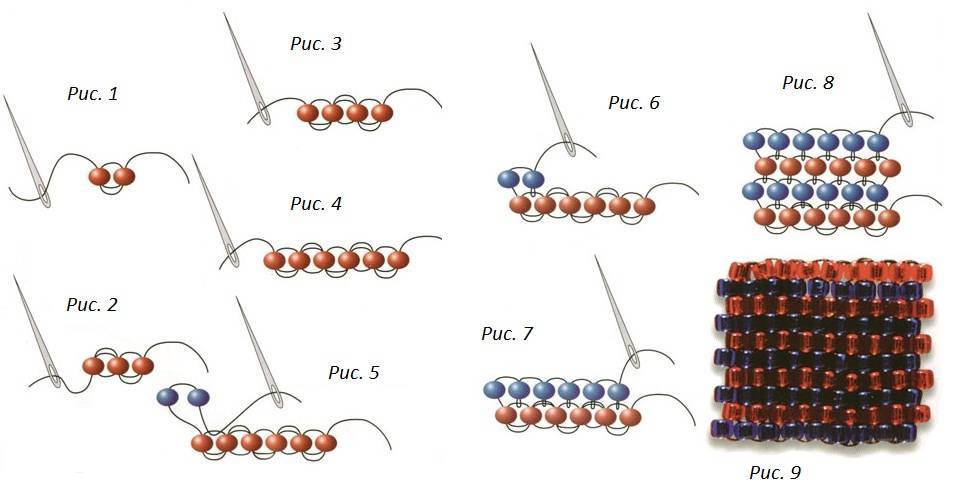 В зависимости от того, какого размера выбран бисер, нужно отрезать длину лески (от 1 до 2 м). Осуществлять нанизывание бисера параллельно на первый и второй ряд одновременно. Потом один конец лески протянуть через бусины противоположного ряда в обратном направлении и затянуть. Затем аналогично нанизывать бисер следующих рядов, фиксируя встречным шагом другого конца лески.