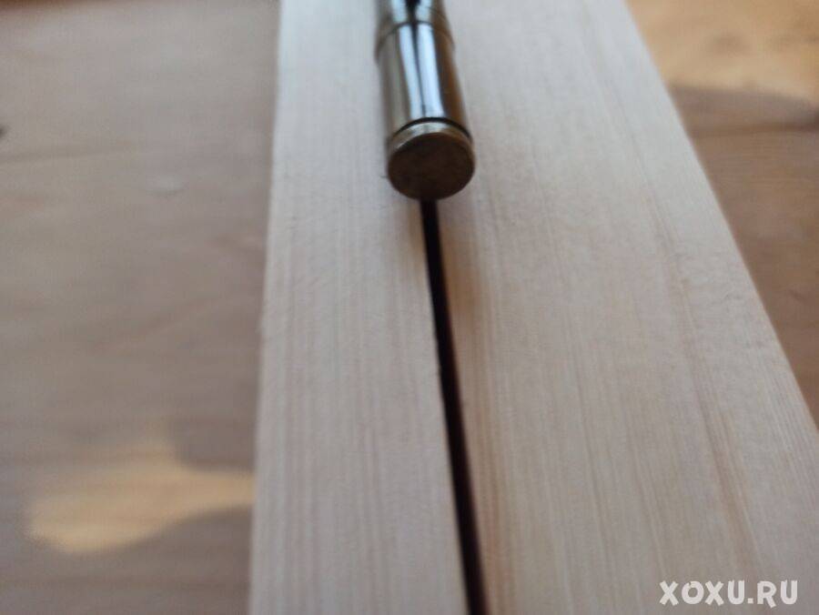 - Уложить их в ряд, сжать в щит и обозначить пазы под шпонки. Пазы надо делать во всю глубину; по ширине: внизу — 50 мм, вверху — 35 мм.