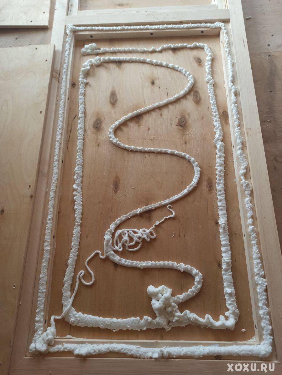 - Заполнить внутренности конструкции наполнителем: опилками, минеральной ватой, пенопластом, монтажной пеной.
