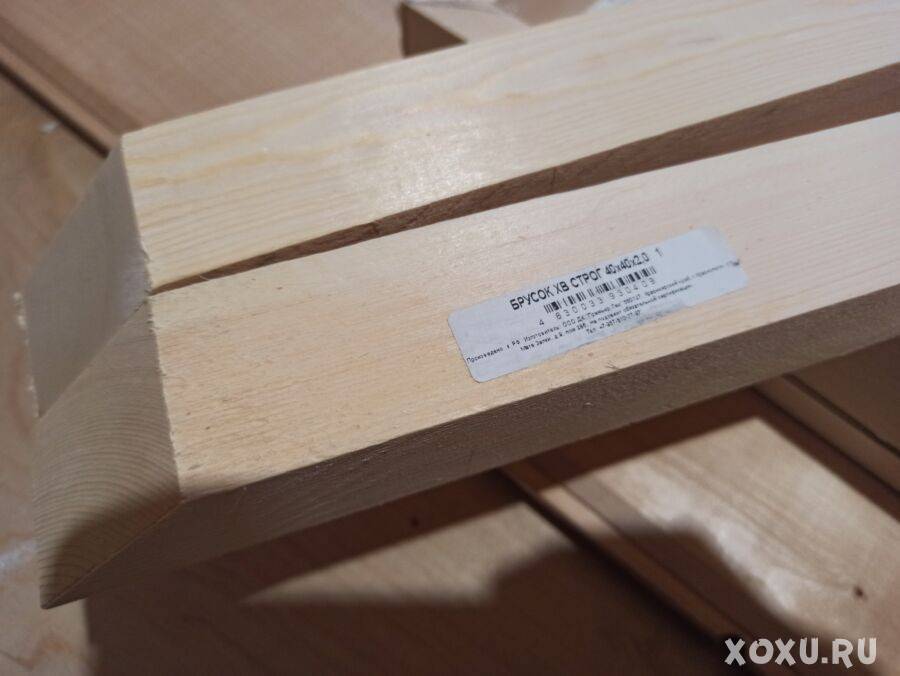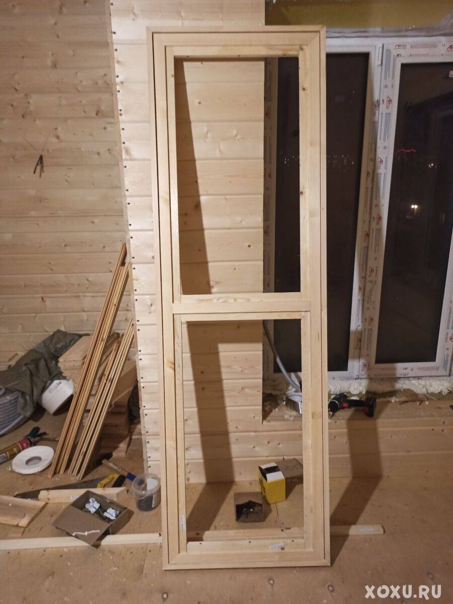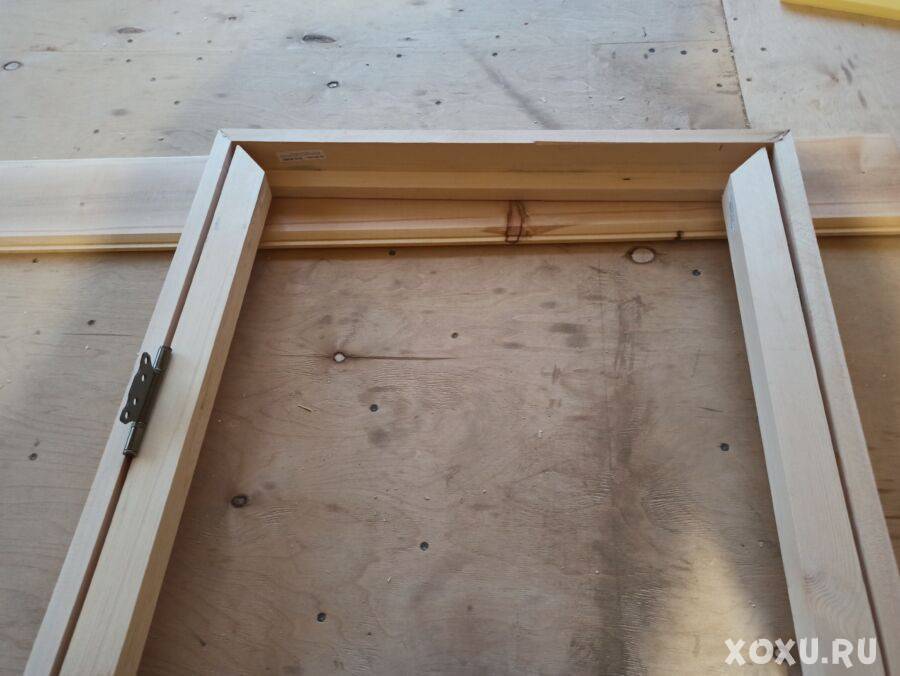 - Отрезаем 2 длинных отрезка бруса и 3 коротких, равных размерам дверной коробки минус 5 мм.